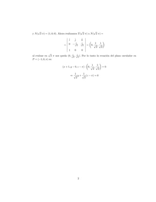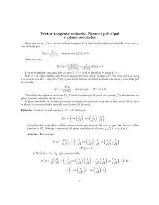 El documento describe el vector tangente unitario, el vector normal principal y el plano osculador de una curva. El vector tangente unitario T apunta en la dirección de la curva en cada punto y tiene magnitud 1. El vector normal principal N es perpendicular a T. Cuando T y N se trazan en un punto, definen el plano osculador, que mejor se adapta a la curva en ese punto. El documento proporciona un ejemplo para ilustrar cómo calcular la ecuación del plano osculador para una hélice circular.