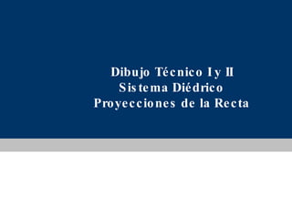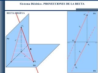 El documento describe las proyecciones de diferentes tipos de rectas en un sistema diédrico, incluyendo rectas oblicuas, frontales, horizontales, paralelas a los planos de proyección, de perfil, verticales, de punta, que pasan por la línea de tierra y perpendiculares a la línea de tierra.