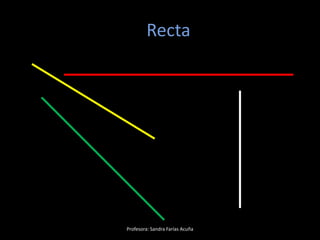 El documento presenta las definiciones básicas de conceptos geométricos como rectas, segmentos de recta, vértices, rectas paralelas, rectas perpendiculares y rectas transversales. Además, instruye al lector a colorear de rojo las rectas paralelas y de azul las rectas perpendiculares en diferentes figuras geométricas.