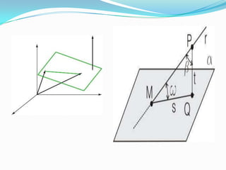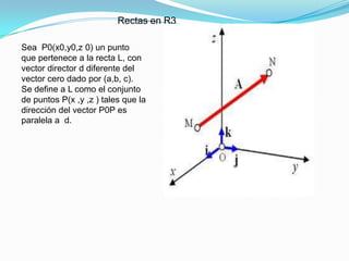 El documento presenta la definición y características de rectas y planos en el espacio tridimensional (R3), incluyendo cómo determinar sus ecuaciones y parámetros. Se explican métodos para hallar la ecuación de una recta a partir de un punto y un vector director, así como la intersección entre planos. Además, describe diversas condiciones para la ecuación de un plano en función de sus vectores normales y puntos en el espacio.