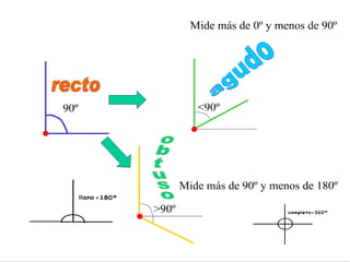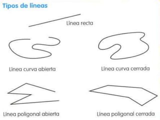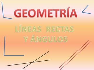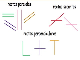 Este documento describe diferentes tipos de líneas y ángulos. Explica que una línea recta no tiene principio ni fin y está formada por infinitos puntos. Un segmento tiene principio y fin, mientras que una semirrecta tiene principio pero no fin. También describe líneas paralelas, secantes y perpendiculares. Finalmente, define un ángulo y sus partes, e identifica tipos de ángulos como rectos y agudos.