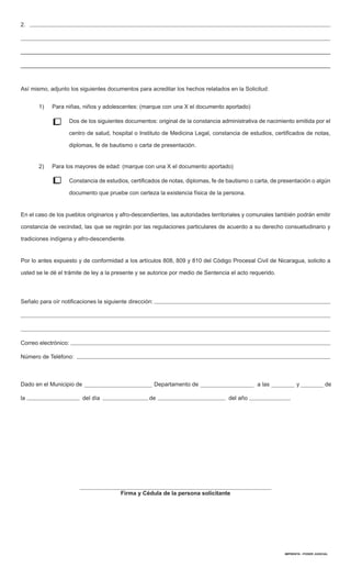 Este documento es una solicitud para rectificar una partida de nacimiento registrada en el Registro del Estado Civil de las Personas. La persona solicitante proporciona sus datos personales y solicita la rectificación de la partida de: (indicar datos registrales). Ofrece como prueba el testimonio de varios testigos. Adjunta documentos como constancias de estudios u otros que prueben la existencia física de la persona. Solicita que se le dé trámite a la solicitud y se autorice la rectificación mediante sentencia judicial de acuerdo a la ley