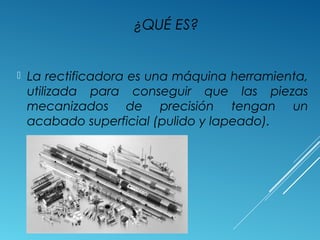 La rectificadora es una máquina herramienta que se usa para dar un acabado de precisión a piezas mecánicas mediante el uso de muelas abrasivas. Se aplica luego de otras operaciones de mecanizado para eliminar los últimos residuos de material. Existen diferentes tipos de rectificadoras como las planas, cilíndricas y universales. El proceso implica altas velocidades de giro de la muela y el uso de lubricantes para enfriar la pieza.