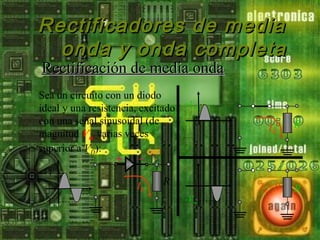 Este documento describe diferentes tipos de rectificadores de señales eléctricas, incluyendo rectificadores de media onda y onda completa. Explica cómo estos circuitos convierten una señal de entrada alterna en una señal continua en la salida. También discute el uso de filtros para suavizar la señal rectificada y reducir el rizado.