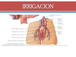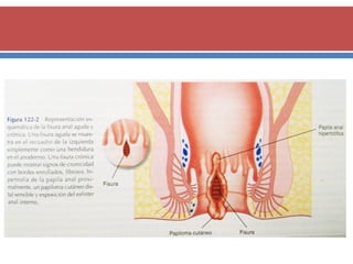 El documento describe la anatomía y función del recto. El recto es el último tramo del tubo digestivo y recibe los desechos después de la digestión para formar las heces. Mide aproximadamente 15 cm y conduce las heces a través del ano. Presenta pliegues que ayudan a retener las heces y receptores que estimulan el deseo de defecar. Cuando el recto se llena, las paredes se distienden y las contracciones peristálticas empujan las heces hacia el ano para su eliminación.
