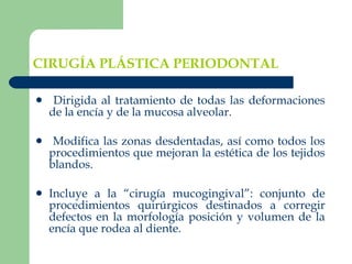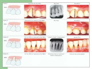 El documento describe diferentes terapias de recubrimiento radicular utilizadas en cirugía periodontal para tratar recesiones gingivales. Explica las indicaciones, factores que deben considerarse, condiciones necesarias para un recubrimiento exitoso y los criterios para evaluar los resultados. También analiza los factores que influyen en los resultados quirúrgicos como el tamaño del defecto, la vascularización, la estabilidad de la herida y el espesor del injerto utilizado.