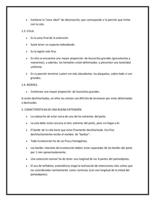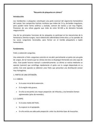 Este documento explica cómo realizar un recuento de plaquetas en un frotis sanguíneo. Describe los pasos para realizar un frotis sanguíneo, incluida la tinción de Wright, y cómo contar plaquetas bajo el microscopio para calcular el recuento de plaquetas por mm3 de sangre. El propósito es enseñar a los estudiantes a identificar células sanguíneas en un frotis y determinar el recuento de plaquetas.