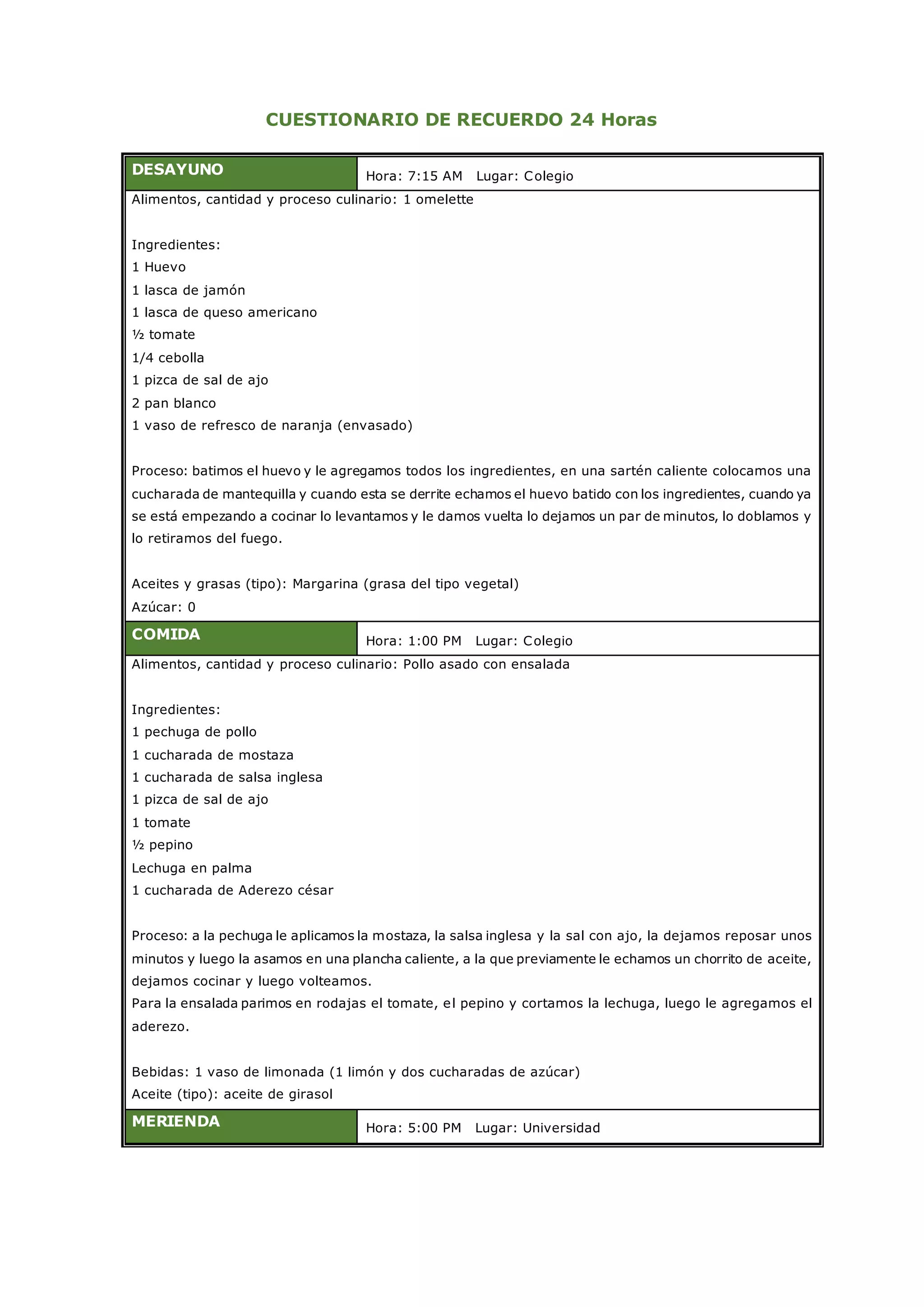 Este documento presenta el resumen de las comidas y snacks consumidos por una persona durante 24 horas. Incluye detalles sobre los ingredientes, cantidades y procesos de preparación de cada alimento. Se describen 7 comidas/snacks consumidos entre las 7:15 AM y las 7:00 PM, que incluyen desayuno (omelette), comida (pollo asado con ensalada), merienda (tres leches), cena (frijoles y plátano fritos), y un snack adicional (frappé de moka). Para cada comida se especifican los ingredientes,