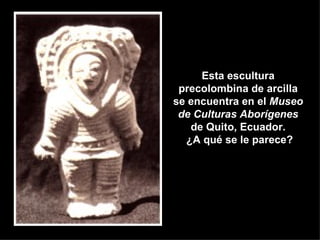 Este documento presenta varias imágenes y objetos antiguos de diferentes épocas y lugares que parecen mostrar evidencia de contacto con tecnologías avanzadas. Incluye esculturas y figuras precolombinas, un objeto del Museo del Oro en Bogotá, una imagen en un fresco del siglo XIV, un cuadro del Renacimiento italiano, la descripción de Marte en la obra de Jonathan Swift, el diseño de una nave espacial basada en la Biblia, un pilar de hierro antiguo en India, y una tumba maya