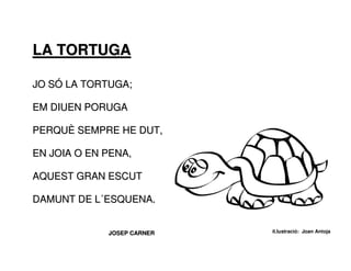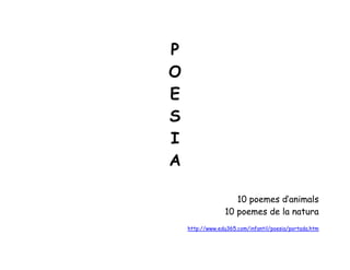 Este documento contiene 20 poemas cortos sobre animales y la naturaleza escritos en catalán por diferentes autores e ilustrados por Joan Antoja. Los poemas describen criaturas como la tortuga, el murciélago, la hormiga, el gato, el delfín y la araña, así como fenómenos naturales como las estaciones, el viento, la lluvia y el sol. Todos los poemas son breves, la mayoría con una o dos estrofas y enfocados en transmitir observaciones sobre la vida silvestre o el medio ambiente a trav