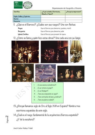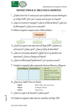 Este documento presenta un repaso de varios temas relacionados con el Siglo XVII en Europa, incluyendo las causas del declive demográfico, el sistema mercantilista, las guerras y monarquías absolutas de la época, los científicos más importantes como Kepler y Newton, las características del estilo barroco en arquitectura, pintura y escultura, el desarrollo de las ciudades y sus problemas asociados, y la denominación del Siglo de Oro en España. Se proporcionan preguntas y tablas para