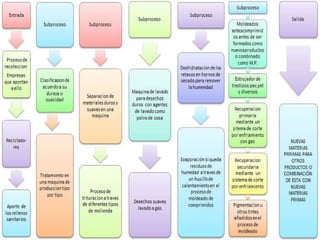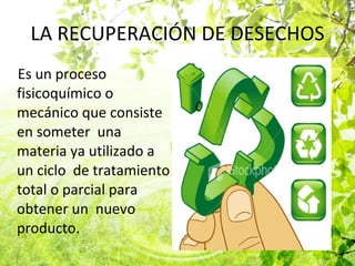 Este documento describe el proceso de recuperación de desechos, que consiste en someter materiales ya utilizados a un tratamiento parcial o total para obtener un nuevo producto. Propone mejoras como realizar el reciclaje de forma mecánica en lugar de química, estimular el reciclaje en hogares y empresas como parte de su responsabilidad social, y formalizar a los recicladores informales. El objetivo final es promover el desarrollo sustentable a través del reciclaje y generar nuevas oportunidades económicas.