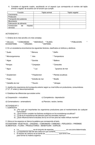 Este documento presenta información sobre los diferentes tejidos vegetales y sus características y funciones. Explica que los tejidos meristemáticos tienen la capacidad de dividirse continuamente para permitir el crecimiento de la planta, mientras que los tejidos fundamentales como el parénquima cumplen funciones estructurales y de almacenamiento. También incluye tablas para completar sobre los tipos de tejidos vegetales y sus características.