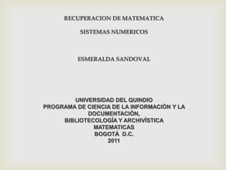 Este documento habla sobre los sistemas numéricos. Explica los números naturales, enteros, racionales e irracionales y cómo se relacionan entre sí. También describe las operaciones básicas que se pueden realizar con números reales como la suma, resta, multiplicación y división.