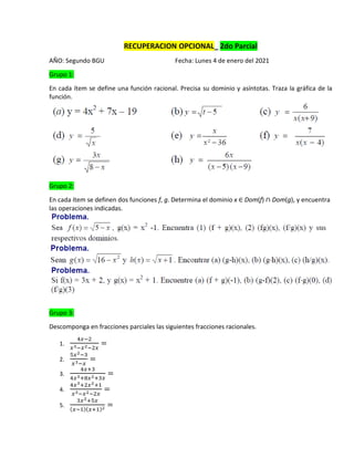 El documento presenta tres grupos de ejercicios de álgebra para una clase de segundo año. El primer grupo implica definir dominios y asintotas de funciones racionales. El segundo grupo involucra determinar dominios y realizar operaciones con funciones. El tercer grupo pide descomponer fracciones racionales en fracciones parciales.