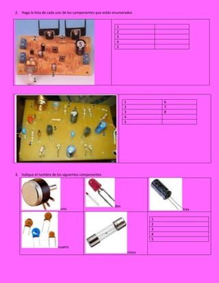 El documento describe dos talleres de electrónica para estudiantes de grado 10 sobre la recuperación de componentes electrónicos y la ley de Ohm. En el primer taller, los estudiantes deben identificar diferentes componentes enumerados en gráficas y hacer listas de ellos. En el segundo taller, los estudiantes deben resolver problemas aplicando la ley de Ohm para calcular voltaje, corriente o resistencia.