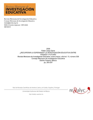 Este documento resume la evolución de la investigación educativa en México desde sus inicios en la década de 1960 hasta la actualidad. Señala que los primeros investigadores concibieron la educación como un objeto de estudio multidisciplinario y ampliaron los objetos de estudio más allá del aula. Desde entonces, la comunidad de investigadores educativos en México ha crecido sustancialmente y ha logrado mayor profesionalización e identidad. Aunque el camino ha tenido avances y desafíos, la investigación educativa en México ya puede reconocer