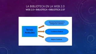La biblioteca 2.0 utiliza herramientas web como blogs, wikis, software social, RSS, mashups y etiquetas para fomentar una mayor participación e interacción entre los usuarios y el personal de la biblioteca. Esto genera un nuevo concepto de comunidad en línea y aprendizaje colaborativo, dando lugar a una inteligencia colectiva y un nuevo modelo de biblioteca.