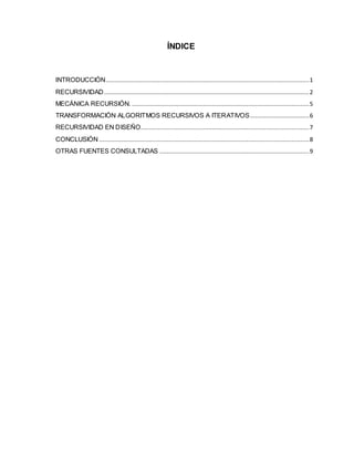 Este documento presenta un reporte de investigación sobre recursividad. Explica conceptos clave como recursión directa e indirecta y características de funciones recursivas como el caso base y caso recursivo. También discute ventajas de programación recursiva como su cercanía a descripciones matemáticas. Finalmente, concluye que recursividad es fundamental en matemáticas y computación para implementar estructuras de repetición.
