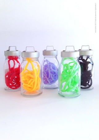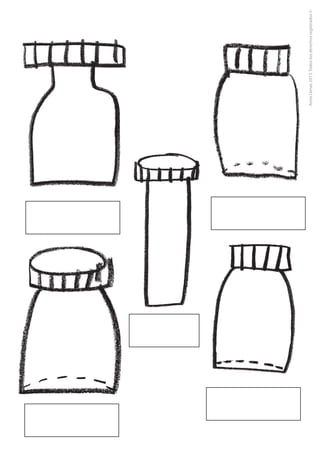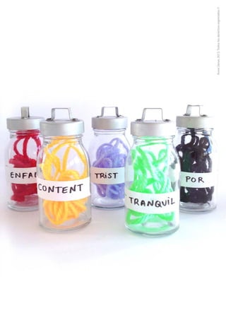 Este documento presenta varios recursos para ayudar a los niños a identificar y nombrar sus emociones básicas. El primer recurso involucra botes de cristal etiquetados con las 5 emociones principales (alegría, tristeza, enojo, miedo y calma) donde los niños colocan lanas de colores correspondientes. Dos recursos adicionales incluyen hojas para colorear monstruos mostrando diferentes emociones o plantillas neutras para que los niños proyecten sus propias emociones. El objetivo
