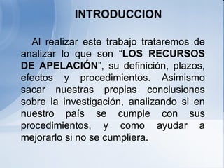 El documento define el recurso de apelación como una vía de recurso que permite reformar, revocar o anular una sentencia ante una jurisdicción superior. Explica que existen condiciones de fondo y forma para interponer un recurso de apelación y que este produce efectos suspensivos o devolutivos. También describe la avocación como la facultad de un juez de segundo grado de fallar sobre la apelación y el fondo de un proceso en una sola sentencia.