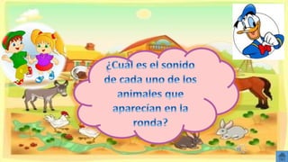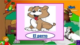 El documento describe los principales animales domésticos, incluyendo perros, gatos, caballos, vacas, cerdos, gallinas, ovejas y patos. Explica los usos y productos que cada animal proporciona a los humanos, como compañía, trabajo, carne, leche, lana y huevos.