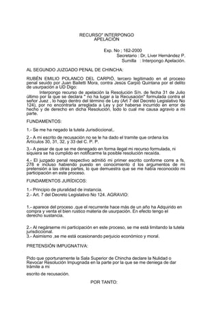 Este documento es una apelación interpuesta ante el Segundo Juzgado Penal de Chincha. El recurrente, Rubén Emilio Polanco del Carpió, apela la resolución que declara "no ha lugar" a su recusación contra el juez del caso. Argumenta que se le negó la tutela jurisdiccional y que su escrito de recusación no siguió el trámite legal correcto. Pide que la Sala Superior de Chincha declare la nulidad de la resolución impugnada o la revoque en la parte que niega dar trámite a su escrit