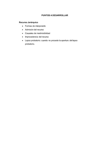 Este documento describe el recurso jerárquico en el derecho tributario venezolano. Explica que el recurso jerárquico puede interponerse mediante un escrito con asistencia legal. La administración tributaria tiene 3 días para admitir o no el recurso. El recurso puede ser inadmisible por falta de interés del recurrente, caducidad de plazos o falta de representación legal. Una vez admitido, se abre un lapso probatorio salvo que se trate solo de cuestiones de derecho o no se hayan propuesto pruebas.