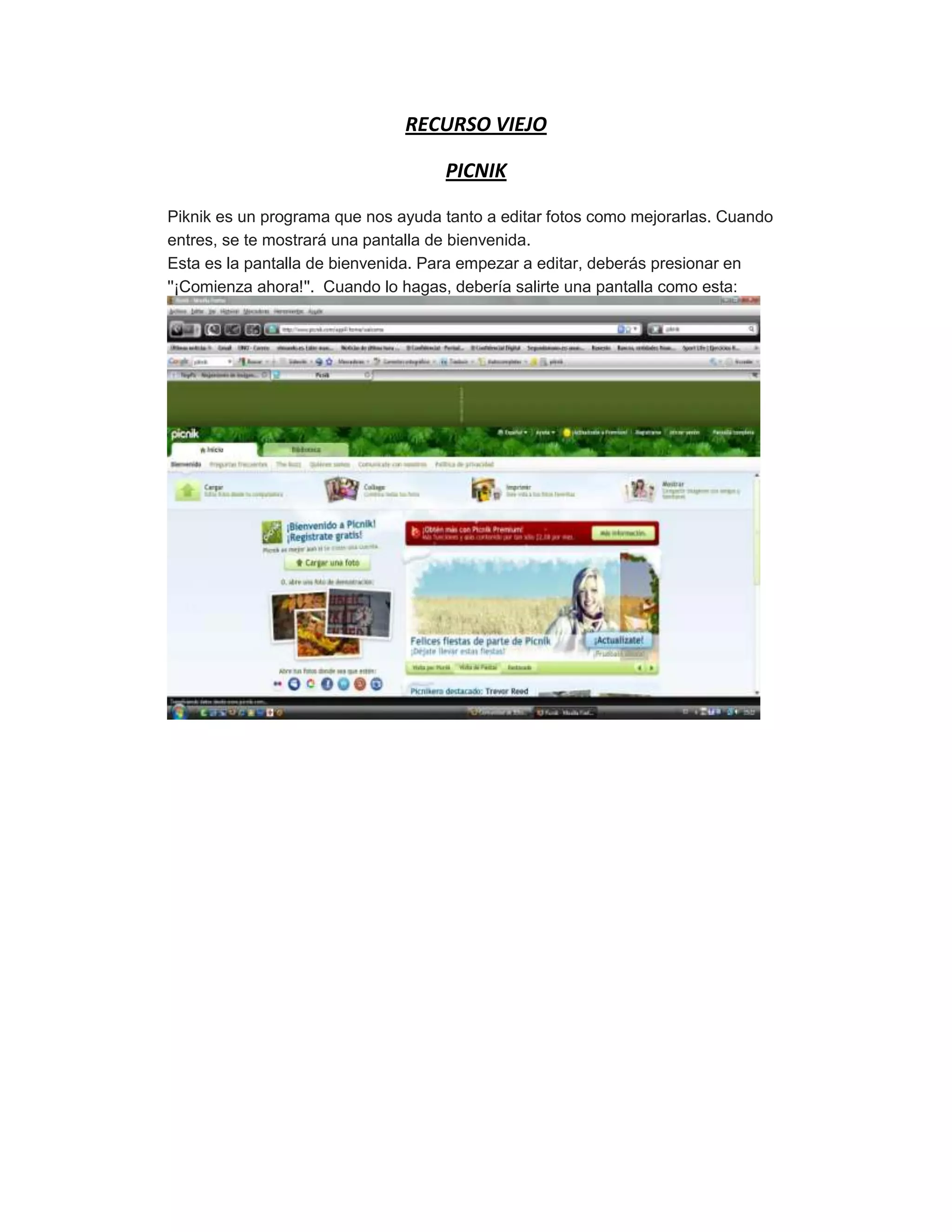 Piknik es un programa para editar y mejorar fotos. Ofrece opciones para añadir texto, adhesivos, marcos y cambiar el color o tamaño de las imágenes. Los usuarios pueden crear una cuenta para guardar sus ediciones o editar fotos sin registrarse. Photofunia es una aplicación web que permite a los usuarios colocar sus imágenes en más de 50 contextos diferentes, como una polera o un grafiti, y luego descargar o compartir las imágenes editadas.