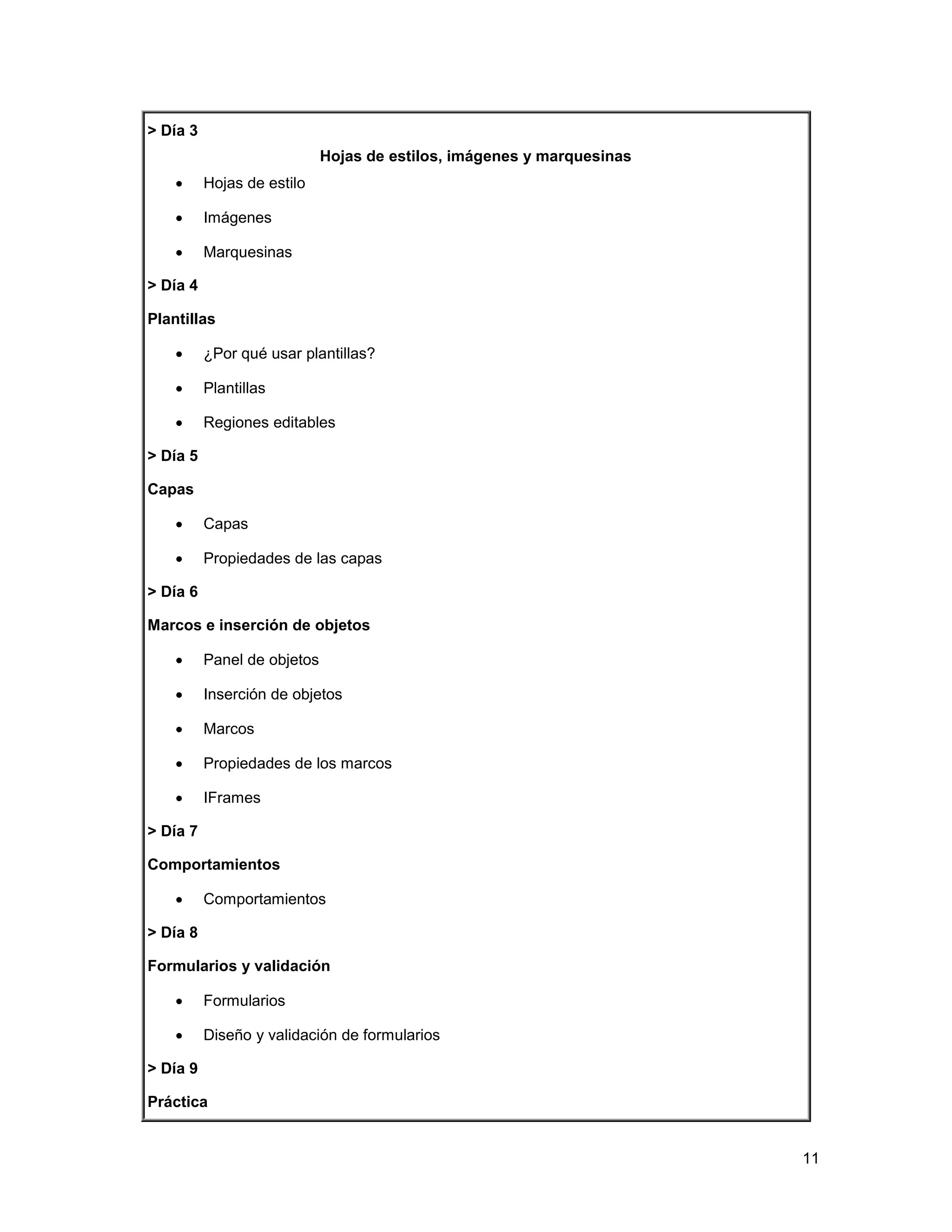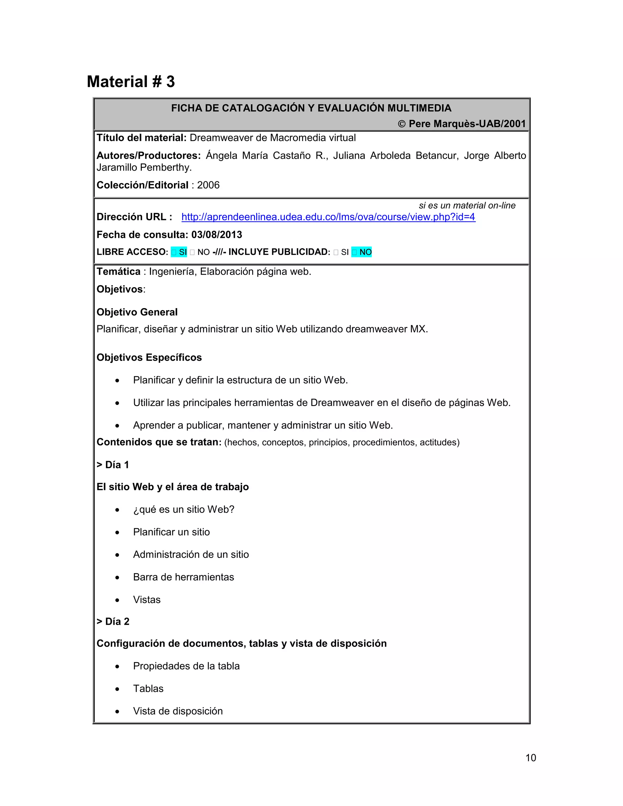 Este documento presenta una evaluación de un curso virtual sobre Dreamweaver de Macromedia. El curso enseña durante 9 días cómo planificar, diseñar y administrar sitios web utilizando Dreamweaver y cubre temas como tablas, hojas de estilo, imágenes, plantillas, capas, marcos e inserción de objetos. El curso está destinado a estudiantes de ingeniería y tiene como objetivo principal enseñar a crear sitios web de manera efectiva.