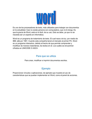 Word es un programa de procesamiento de texto ampliamente utilizado que permite crear, modificar e imprimir documentos de forma sencilla e interactiva. PowerPoint es un programa para crear presentaciones que se usa comúnmente en negocios y educación, permitiendo agregar diapositivas con texto, gráficos y videos. Google Docs es una herramienta en línea gratuita para crear y almacenar documentos y hojas de cálculo que puede ser accedida desde cualquier dispositivo y que permite la colaboración en grupo.