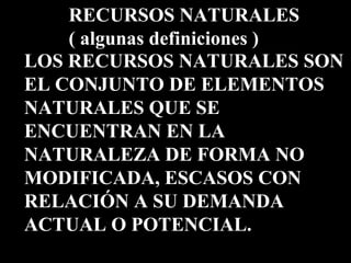 El documento define los recursos naturales como elementos naturales no modificados por el hombre que son escasos en relación a la demanda actual o potencial. Explica que los recursos naturales son bienes y servicios que provee la naturaleza y son valiosos para las sociedades humanas. Además, clasifica los recursos naturales en no renovables, renovables e inagotables y proporciona ejemplos como el agua, el suelo, el aire y los minerales.