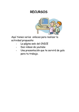 Este documento proporciona recursos para una actividad, incluyendo un enlace a la página web del CNICE, dos videos de YouTube y una presentación que sirve como guía para el trabajo.