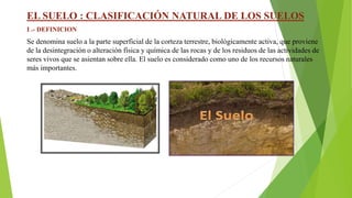 El documento presenta una clasificación natural de los suelos según la taxonomía estadounidense, describiendo 11 clases de suelos. También describe el potencial agrícola, pecuario y forestal del Perú, señalando que el país posee un importante potencial de expansión agrícola debido a la disponibilidad de tierras no cultivadas. Finalmente, presenta información sobre la agricultura en La Libertad, mencionando su variedad de climas y suelos.