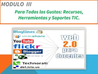 El módulo III se titula "Para Todos los Gustos: Recursos, Herramientas y Soportes TIC" y parece tratar sobre diferentes recursos, herramientas y soportes relacionados con las tecnologías de la información y la comunicación que pueden satisfacer diversas necesidades y preferencias.
