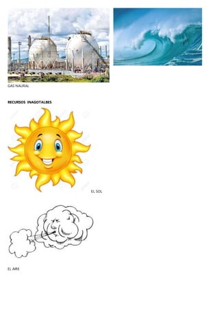 El documento describe la importancia de los recursos naturales para satisfacer las necesidades humanas ilimitadas, mencionando que proporcionan materia prima, alimentos, minerales y servicios ambientales. También señala que las reservas de helio de la Tierra se están agotando y probablemente se acabarán en 2018. Finalmente, clasifica los recursos en renovables como plantas, animales y suelo, no renovables como minería, petróleo y gas natural, e inagotables como el sol y el aire.