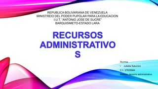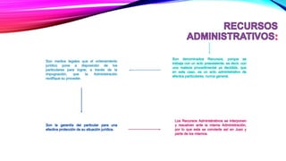 El documento detalla disposiciones sobre recursos administrativos en Venezuela, incluyendo el recurso de reconsideración, jerárquico y de revisión. Establece plazos para la interposición de recursos, condiciones para su admisión y efectos sobre la ejecución de actos administrativos. Se especifica que ciertos actos administrativos son sujetos a revisión y se define la competencia de los órganos para conocer y decidir sobre estos recursos.