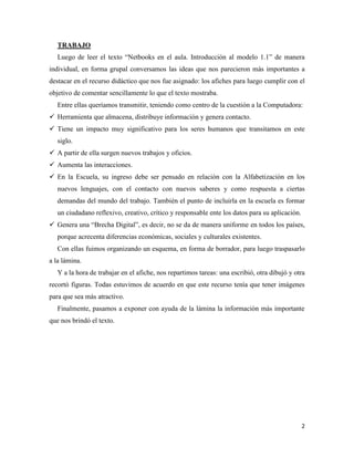 El documento describe un trabajo práctico grupal realizado por tres estudiantes sobre el tema de las nuevas tecnologías en la enseñanza. Primero, las estudiantes leyeron un texto y discutieron las ideas más importantes para incluir en un afiche. Luego organizaron esas ideas en un borrador y diseñaron el afiche, asignando tareas como escribir, dibujar y recortar. Finalmente, presentaron el afiche terminado con imágenes y la información clave del texto.