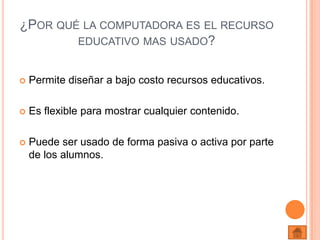 Este documento describe los recursos audiovisuales y presentaciones colectivas, destacando que las computadoras son el recurso educativo más usado debido a su bajo costo, flexibilidad para mostrar contenido y capacidad de ser usado de forma pasiva o activa por los alumnos. Explica que las presentaciones colectivas permiten incluir textos, sonidos, imágenes estáticas, imágenes en movimiento y videos, y tienen la ventaja de presentar varios elementos de forma a grupos numerosos de manera fácil de producir.
