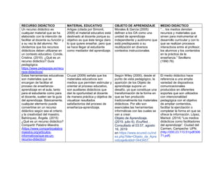 El documento define y discute varios términos relacionados con recursos educativos como recursos didácticos, materiales educativos, objetos de aprendizaje y medios didácticos. Explica que estos son herramientas que facilitan el proceso de enseñanza-aprendizaje al proporcionar experiencias que motivan a los estudiantes y les ayudan a adquirir conocimientos y habilidades. El documento también analiza las definiciones de estos términos según diferentes autores y enfatiza que los recursos educativos