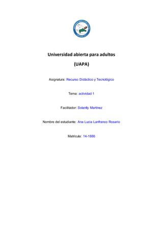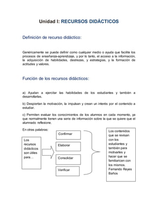 Este documento define los recursos didácticos como cualquier medio o ayuda que facilite los procesos de enseñanza-aprendizaje. Explica que los recursos didácticos ayudan a ejercitar y desarrollar habilidades de los estudiantes, despiertan su motivación e interés, y permiten evaluar sus conocimientos. Además, destaca la importancia de los recursos didácticos en el proceso de enseñanza-aprendizaje y enumera algunos tipos como materiales convencionales, audiovisuales y tecnologías