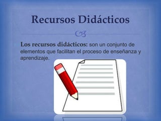 El documento describe los recursos didácticos, que son elementos que facilitan el proceso de enseñanza y aprendizaje. Explica que ayudan a sintetizar temas, despertar interés, ilustrar puntos difíciles y hacer la enseñanza dinámica. También detalla ventajas como racionalizar el trabajo y motivar a estudiantes, así como posibles desventajas como distracción o cansancio. Finalmente, enumera varios tipos de recursos como casos prácticos, apuntes, videos, presentaciones y blogs.