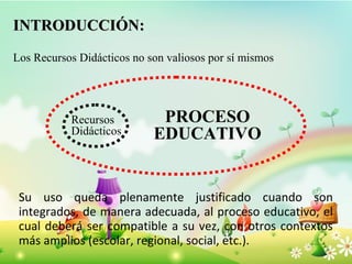 Este documento describe los recursos didácticos y su uso en el proceso educativo. Explica que los recursos didácticos son auxiliares que facilitan la enseñanza y el aprendizaje al proporcionar experiencias sensoriales sobre los contenidos. También clasifica los recursos didácticos y describe algunos ejemplos como apuntes de clase, proyectores, videos y blogs. El documento concluye que los recursos didácticos deben integrarse adecuadamente en el proceso educativo para apoyar el logro de los objetivos.