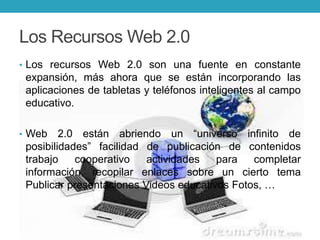 Este documento describe recursos educativos en línea como Dropbox, Edmodo, Twitter, Facebook, SlideShare y YouTube que pueden usarse para compartir información, comunicarse y colaborar. Explica cómo cada plataforma permite almacenar, publicar y compartir contenido de manera fácil entre estudiantes y profesores. Resalta que el éxito del uso de estos recursos depende de la planeación del profesor para integrarlos de manera creativa en la enseñanza.