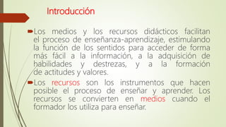 Este documento describe los factores a considerar al seleccionar recursos didácticos. Explica que los recursos facilitan el aprendizaje estimulando los sentidos. Luego, detalla varios criterios para seleccionar los recursos como las capacidades a desarrollar, los conocimientos previos de los estudiantes, el contexto y el estilo de enseñanza del docente. Finalmente, enfatiza que la mejor estrategia es combinar diferentes recursos didácticos.