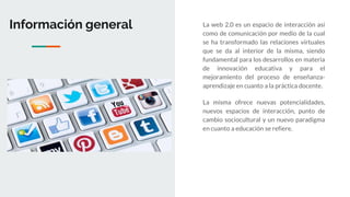 Este documento describe las herramientas de la Web 2.0 y su uso educativo. Explica que la Web 2.0 ofrece nuevos espacios de interacción y cambios socioculturales que han transformado la educación. Luego describe wikis, blogs y redes sociales como herramientas educativas que permiten la colaboración, interacción y compartir material didáctico. También cubre el almacenamiento en la nube para respaldar la comunicación y archivar documentos y archivos en formatos diversos.
