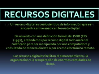 Un recurso digital es cualquier información almacenada digitalmente, incluyendo material codificado para ser manipulado por computadoras y accedido de forma directa o remota. Los recursos digitales facilitan el almacenamiento y organización de grandes cantidades de datos e incluyen computadoras, Internet, audio y video digital, agendas electrónicas y dispositivos móviles.