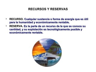 La geosfera proporciona una variedad de recursos energéticos y minerales que son esenciales pero cuya extracción y uso tienen impactos ambientales. Los combustibles fósiles como el carbón, el petróleo y el gas natural, aunque no renovables, actualmente satisfacen la mayor parte de las necesidades energéticas mundiales. Sin embargo, su uso genera contaminación y contribuye al cambio climático. Los recursos minerales también son cruciales pero su explotación plantea riesgos para la salud y el medio ambiente que deben mitigarse.