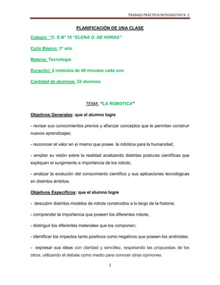 Este documento presenta la planificación de una clase sobre robótica para estudiantes de tercer año de la escuela secundaria. La clase se dividirá en tres partes: inicio, desarrollo y cierre, e incluirá actividades grupales, videos, presentaciones y la construcción de un prototipo de robot. El objetivo es que los estudiantes comprendan los conceptos básicos de la robótica a través de un enfoque práctico y colaborativo.