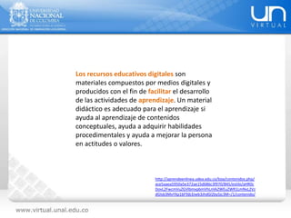 Este documento describe los recursos educativos digitales, que son materiales compuestos por medios digitales creados para facilitar el aprendizaje. Explica que deben ayudar a los estudiantes a aprender contenidos, habilidades y actitudes. También señala algunas ventajas de los recursos digitales como motivar a los estudiantes, ilustrar procesos de manera interactiva y permitir el autoaprendizaje a su propio ritmo. Finalmente, resalta la importancia de que los docentes busquen, evalúen, produzcan y